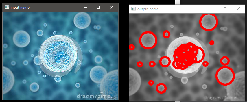 {Mat src, dst,srcGray;src = imread("D:/VS project/Image/circle.jpg");if (src.empty()){cout << "找不到图像" << endl;return -1;}namedWindow(inputName, CV_WINDOW_AUTOSIZE);imshow(inputName, src);namedWindow(outputName, CV_WINDOW_AUTOSIZE);//第一步中值滤波降噪medianBlur(src, srcGray, 5);cvtColor(srcGray, srcGray, COLOR_BGR2GRAY);//第二步霍夫检测圆vector circles;HoughCircles(srcGray, circles, HOUGH_GRADIENT, 1, 10, 100, 30, 5, 50);//变回彩图cvtColor(srcGray, dst, COLOR_GRAY2BGR);Scalar color = Scalar(0, 0, 255);for (size_t i = 0; i < circles.size(); i++){Vec3f c = circles[i];circle(dst, Point(c[0], c[1]), c[2], color, 5,LINE_AA);}imshow(outputName, dst);waitKey(0);return 0;