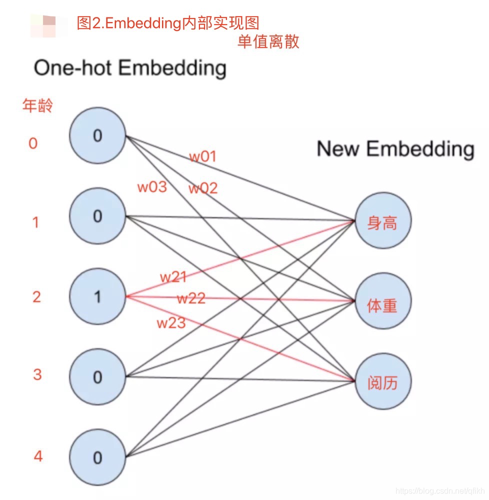 图1. 是Embedding 内部网络结构图,直接将年龄分桶之后的值(age=2)作为Embedding的输入,然后embedding内部将age=2 映射成一个1*5的向量[0,0,1,0,0] 通过全连接网络得到 3维隐向量。假设 年龄分桶之后取值(0,5),0对应(0~20)岁,4对应(80,100)岁,先将每样样本的年龄进行onehot,然后将onehot映射成一个3维向量,比如这三维向量是身高,体重,阅历。显然w01 要小于w21;w11>w21>w41,因为人的身高先增大,后减小,20-40岁之间最大。