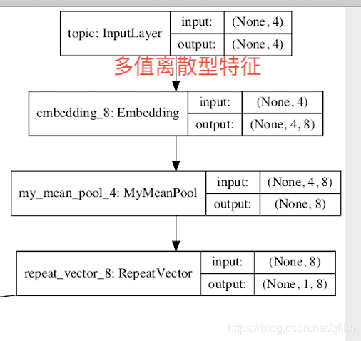 最后,多值离散型field可以同时取多个特征值,为了batch training,必须对样本进行补零padding。相似地可用Embedding层实现,Value并不是必要的,但Value可以作为mask来使用,当然也可以在Embedding中设置mask_zero=True。Ref:https://blog.csdn.net/songbinxu/article/details/80151814