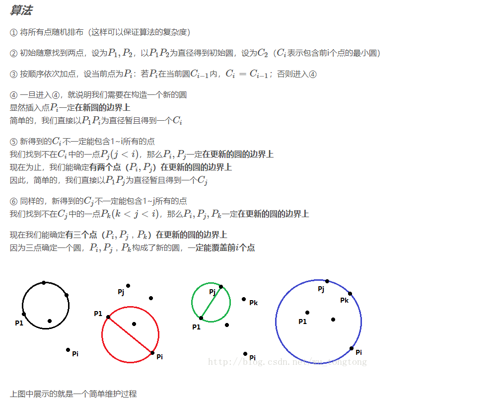 {if (fabs(x)0) //pi在圆外部{ c=p[i];r=0; //将圆心设为pi半径为0for (int j = 0; j < i; ++j) //重新检查前面的点{if (sgn(Distance(p[j],c)-r)>0)//两点定圆{c.x=(p[i].x+p[j].x)/2;c.y=(p[i].y+p[j].y)/2;r=Distance(p[j],c);for (int k = 0; k < j; ++k){if (sgn(Distance(p[k],c)-r)>0){c=circle_center(p[i],p[j],p[k]);r=Distance(p[i],c);}}}}}}
