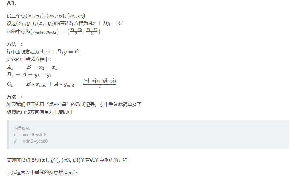 若叉积不为0,即三个点不共线,那么就求三角形的外接圆