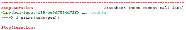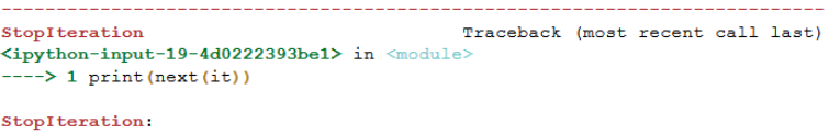 是的,我们得到了一个错误!如果我们在到达迭代器的末尾之后尝试访问下一个值,则会引起StopIteration异常,该异常的意思是“你不能更进一步了!”。