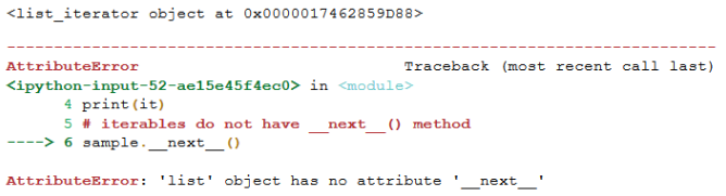 while True: # this will execute till an error is raised try: val = next(it) # when we reach end of the list, error is raised and we break out of the loop except StopIteration: break print(val)