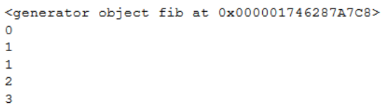 def fib(): prev, curr = 0, 1 # infinite loop while prev<5: value = prev # Calculate the next number in the sequence. Using Tuple unpacking. prev, curr = curr, prev + curr # yield the value yield value