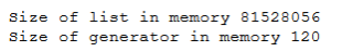 print('Size of generator in memory',sys.getsizeof(mygen)