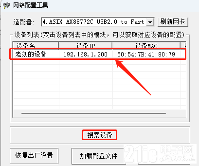 老刘使用的是USB转RJ45网口的工具,通过网线连接到芯片的,打开网络配置工具将适配器的选项选择