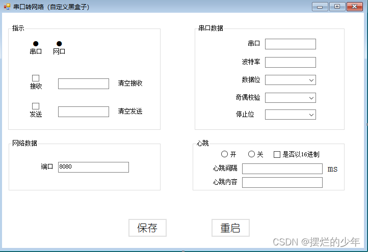 {public partial class Form1 : Form{public Form1(){InitializeComponent();//string[] strings = SerialPort.GetPortNames();}private void Form1_Load(object sender, EventArgs e){//给数据位下拉框赋值cbData.Items.AddRange(new object[] {8,7,6,5 });//获取奇偶校验枚举中的数据名称string[] paritys = Enum.GetNames(typeof(Parity));cbParity.Items.AddRange(paritys);//获取停止位枚举中的数据名称string[] stops = Enum.GetNames(typeof(StopBits));cbStop.Items.AddRange(stops);//初始化ini文件操作//串口数据string portName = iniUtil.Read("Serial", "PortName");//名称int baudRate = iniUtil.ReadInt("Serial", "BaudRate", 4800);//波特率int dataBits = iniUtil.ReadInt("Serial", "DataBits", 8);//数据位int parity = iniUtil.ReadInt("Serial", "Parity", 0);//奇偶校验int stopBits = iniUtil.ReadInt("Serial", "StopBits", 1);//停止位//网络数据 int port = iniUtil.ReadInt("TcpService", "Port", 8500);//端口//心跳数据bool heartbeat = iniUtil.ReadBool("Heartbeat","rbHeart",false);int heartSpace = iniUtil.ReadInt("Heartbeat","heartSpacer",60*1000);//需要改ReadStr()string heartPart = iniUtil.Read("Heartbeat", "heartPart");bool heartIsHex = iniUtil.ReadBool("Heartbeat", "IsHex", true);//给文本框赋值tbSerial.Text = portName;tbRate.Text = baudRate.ToString();cbData.Text = dataBits.ToString();cbParity.SelectedIndex = parity;cbStop.SelectedIndex = stopBits;tbPort.Text = port.ToString();ckIsHex.Checked = heartIsHex;rbHeartClose.Checked = !heartbeat;rbHeartOpen.Checked = heartbeat;tbHeartSpacer.Text = heartSpace.ToString();tbHeartPart.Text = heartPart;Task.Run(async () => {while (true) {//循环启动串口StartSerial(portName, baudRate, dataBits, (Parity)parity, (StopBits)stopBits);await Task.Delay(1000);}});//启动服务端StartTcpService(port);//启动心跳if (heartbeat) //心跳开关{byte[] buffer;if (heartIsHex) //心跳为16进制{string[] hexs = heartPart.Split(new string[] { " "},StringSplitOptions.RemoveEmptyEntries);buffer = new byte[hexs.Length];for (int i = 0; i < hexs.Length; i++){buffer[i] = Convert.ToByte(hexs[i], 16);}}else //心跳为字符串{buffer = Encoding.UTF8.GetBytes(heartPart);}timer1.Enabled = true;timer1.Interval = heartSpace;timer1.Tick += (s1,e1) => {//发送心跳if (clients.Count == 0) {return;}for (int i=0;i clients = new List();Socket service;private void StartTcpService(int port) {service = new Socket(AddressFamily.InterNetwork, SocketType.Stream, ProtocolType.Tcp);try {service.Bind(new IPEndPoint(IPAddress.Any, port));service.Listen(8);Console.WriteLine("服务端启动成功");}catch (Exception ex){Console.WriteLine($"启动服务端异常:+{ex.Message}");return;}Task.Run(() =>{while (true) {try{Socket client = service.Accept();//等待客户端连接this.BeginInvoke(new Action(() =>{TcpServiceLight.ForeColor = Color.Lime;}));clients.Add(client);//将客户端连接存入集合ReceviceClientData(client);//接收客户端消息} catch (Exception ex){Console.WriteLine("等待客户端连接异常:{0}",ex.Message);} }});}//循环接收客户端消息private void ReceviceClientData(Socket client){Task.Run(() => {try {while (true){byte[] buffer = new byte[1024];int length = client.Receive(buffer);if (length == 0) {throw new Exception("客户端发送的消息长度为0,认为客户端下线了");}this.BeginInvoke(new Action(() =>{//接收数据时亮灯LighterUp(ligtherGet);tbGet.Text = length.ToString() + "字节";}));//第3步,把消息发送给串口设备if (serialPort1.IsOpen){serialPort1.Write(buffer, 0, length);}}}catch (Exception ex){Console.WriteLine($"接收{client.RemoteEndPoint.ToString()}:客户端消息异常"+ex.Message);this.BeginInvoke(new Action(() =>{tbGet.Text = "0";}));CloseTcpClient(client);//关闭客户端}});}//Tcp服务端接收串口发送过来的消息private void serialPort1_DataReceived(object sender, SerialDataReceivedEventArgs e){//读取串口数据byte[] buffer = new byte[serialPort1.BytesToRead];int length = serialPort1.Read(buffer, 0, buffer.Length);//给每一个客户端发送数据int count = clients.Count;for (int i = 0;i{LighterUp(lighterTo);tbTo.Text = length1.ToString() + "字节";}));}}//关闭TCP客户端private void CloseTcpClient(Socket client) {if (clients.Contains(client)) {clients.Remove(client);}client?.Close();this.BeginInvoke(new Action(() =>{tbTo.Text = "0";TcpServiceLight.ForeColor = Color.Black;}));}//接收和发送消息时亮一下灯private void LighterUp(Control lighter) {this.BeginInvoke(new Action(async () =>{lighter.BackColor = Color.Lime;await Task.Delay(60);lighter.BackColor = Color.White;}));}//清空接收或者发送字节框private void Clear1_DoubleClick(object sender, EventArgs e){Label lab = sender as Label;if (lab.Text == "清空接收"){tbGet.Text = "0";}else if (lab.Text == "清空发送"){tbTo.Text = "0";}}//保存数据到ini文件private void btnSave_Click(object sender, EventArgs e){iniUtil.Write("Serial", "PortName", tbSerial.Text);//串口名称iniUtil.Write("Serial", "BaudRate", tbRate.Text);//波特率iniUtil.Write("Serial", "DataBits", cbData.Text);//数据位iniUtil.Write("Serial", "Parity", cbParity.SelectedIndex.ToString());//奇偶校验iniUtil.Write("Serial", "StopBits", cbStop.SelectedIndex.ToString());//停止位iniUtil.Write("TcpService", "Port",tbPort.Text);//端口iniUtil.Write("Heartbeat", "rbHeart", Convert.ToString(rbHeartOpen.Checked));//心跳是否关闭iniUtil.Write("Heartbeat", "heartSpacer",tbHeartSpacer.Text);//心跳间隔iniUtil.Write("Heartbeat", "heartPart", tbHeartPart.Text);//心跳内容iniUtil.Write("Heartbeat", "IsHex", Convert.ToString(ckIsHex.Checked));//心跳内容MessageBox.Show("保存成功");}//重启private void startAgain_Click(object sender, EventArgs e){service?.Close();if (serialPort1.IsOpen) {serialPort1.Close();}//重启一个程序,方法一//this.Close();//Application.ExecutablePath==>获取当前程序路径(包含程序名称exe)//Process.Start(Application.ExecutablePath);//方法二Application.Res