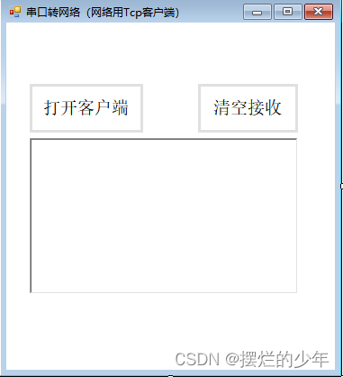 {public partial class Form1 : Form{public Form1(){InitializeComponent();}Socket client;private void btnOpenOrClose_Click(object sender, EventArgs e){if (btnOpenOrClose.Text == "打开客户端"){Task.Run(new Action(() =>{StartClient();}));btnOpenOrClose.Text = "关闭客户端";btnOpenOrClose.ForeColor = Color.Red;}else if(btnOpenOrClose.Text == "关闭客户端"){client?.Close();btnOpenOrClose.Text = "打开客户端";btnOpenOrClose.ForeColor = Color.Black;}}//开启客户端private void StartClient() {client = new Socket(AddressFamily.InterNetwork,SocketType.Stream,ProtocolType.Tcp);try {client.Connect(new IPEndPoint(IPAddress.Parse("192.168.152.1"), 5005));Console.WriteLine("客户端启动成功");//循环接收服务端发送过来的数据while (true){byte[] buffer = new byte[1024];int length = client.Receive(buffer);if (length == 0){MessageBox.Show("服务端关闭");return;}//把接收到的服务端数据发给串口if (serialPort1.IsOpen) {serialPort1.Write(buffer, 0, length);}}} catch(Exception ex) {Console.WriteLine("未连接上服务端:"+ex.Message);} }private void Form1_Load(object sender, EventArgs e){Task.Run(new Action(async () => {while (true){StartSearial();await Task.Delay(1000);}}));}//启动串口private void StartSearial() {if (!serialPort1.IsOpen) {//获取ini文件数据string portName = iniUtil.Read("Serial", "PortName");//名称int baudRate = iniUtil.ReadInt("Serial", "BaudRate", 4800);//波特率int dataBits = iniUtil.ReadInt("Serial", "DataBits", 8);//数据位int parity = iniUtil.ReadInt("Serial", "Parity", 0);//奇偶校验int stopBits = iniUtil.ReadInt("Serial", "StopBits", 1);//停止位//设置串口数据serialPort1.PortName = portName;serialPort1.BaudRate = baudRate;serialPort1.DataBits = dataBits;serialPort1.Parity = (Parity)parity;serialPort1.StopBits = (StopBits)stopBits;try{//启动串口serialPort1.Open();Console.WriteLine("串口启动成功");}catch (Exception ex){Console.WriteLine("串口启动失败:" + ex.Message);return;}}}private void serialPort1_DataReceived(object sender, SerialDataReceivedEventArgs e){byte[] buffer = new byte[serialPort1.BytesToRead];int length = serialPort1.Read(buffer,0,buffer.Length);if (client != null && client.Connected) {StringBuilder sb = new StringBuilder();for (int i =0;i{rbData.Text += sb;}));client.Send(buffer,0,buffer.Length,SocketFlags.None);}}//清空接收private void btnClose_Click(object sender, EventArgs e){rbData.Text = "";}}