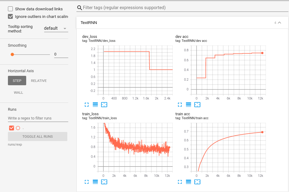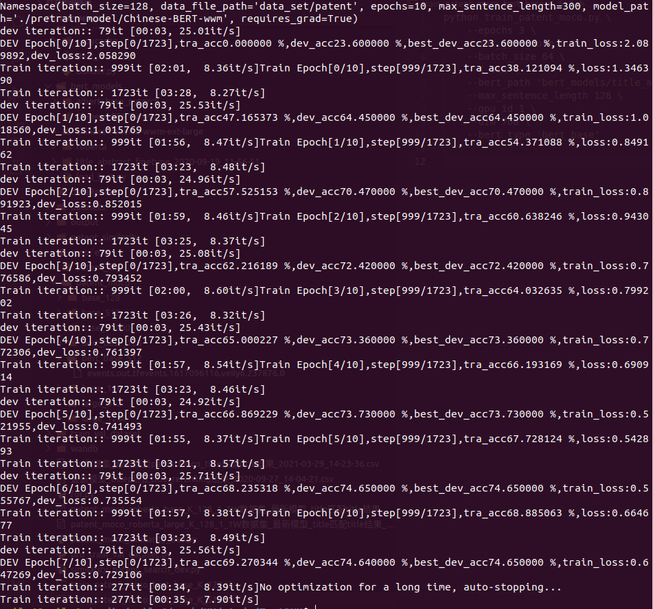 首先看看大模型和小模型单独的效果如何,这里就把单独训练的过程和结果展示一下,具体的代码不做演示(可参考我的博客文章——基于机器学习算法和pytorch实现的深度学习模型的中文长文本多分类任务实战——TextBert和TextRNN部分内容)。特此说明该次训练采用的预训练模型是roberta模型而不是Chinese-BERT-wwm模型。