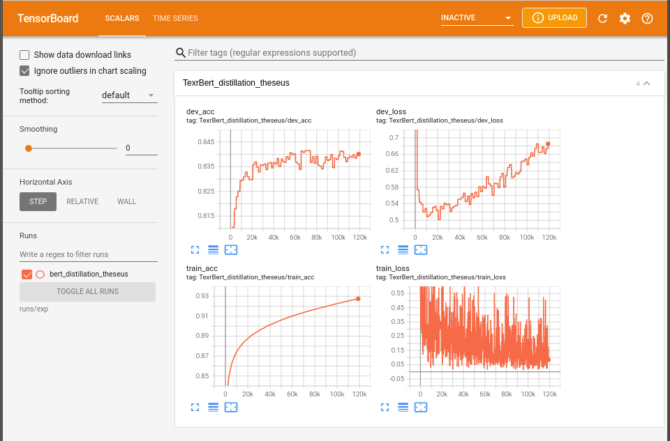 def train(teacher_model,student_model,train_loader,dev_loader,args):teacher_model.to('cuda')student_model.to('cuda')#teacher网络参数不更新for name,params in teacher_model.named_parameters():params.requires_grad = False# 初始学习率,student网络参数梯度更新optimizer_params = {'lr': 1e-3, 'eps': 1e-8}optimizer = AdamW(student_model.parameters(), **optimizer_params)scheduler = ReduceLROnPlateau(optimizer, mode='max', factor=0.5, min_lr=1e-6, patience=2, verbose=True,eps=1e-8) # mode max表示当监控量停止上升时,学习率将减小;min表示当监控量停止下降时,学习率将减小;这里监控的是dev_acc因此应该用max# #teacher网络输出和student网络输出进行损失计算# soft_criterion = nn.KLDivLoss()#teacher网络输出和student网络输出进行损失计算soft_criterion = nn.MSELoss()#student网络和label进行损失计算hard_criterion = nn.CrossEntropyLoss()#alpha(0,1)之间——两个loss的权重系数alpha = args.alpha#T_softmax()的超参[1,10,20]等等值可以多测试几个T = 10early_stop_step = 50000last_improve = 0 #记录上次提升的stepflag = False # 记录是否很久没有效果提升dev_best_acc = 0dev_loss = float(50)dev_acc = 0correct = 0total = 0global_step = 0epochs = args.epochsfor epoch in range(args.epochs):for step,batch in enumerate(tqdm(train_loader,desc='Train iteration:')):global_step += 1optimizer.zero_grad()batch = tuple(t.to('cuda') for t in batch)input_ids = batch[0]input_mask = batch[1]label = batch[2]student_model.train()stu_output = student_model(input_ids)tea_output = teacher_model(input_ids,input_mask).detach()#soft_loss————studetn和teach之间做loss,使用的是散度losssoft_loss = soft_criterion(F.log_softmax(stu_output/T,dim=1),F.softmax(tea_output/T,dim=1))*T*T# #soft_loss————studetn和teach之间做loss,使用的是logits的Mse损失# soft_loss = soft_criterion(stu_output,tea_output)#hard_loss————studetn和label之间的loss,交叉熵hard_loss = hard_criterion(stu_output,label)loss = soft_loss*alpha + hard_loss*(1-alpha)loss.backward()optimizer.step()total += label.size(0)_,predict = torch.max(stu_output,1)correct += (predict==label).sum().item()train_acc = correct / totalif (step+1)%1000 == 0:print('Train Epoch[{}/{}],step[{}/{}],tra_acc{:.6f} %,loss:{:.6f}'.format(epoch,epochs,step,len(train_loader),train_acc*100,loss.item()))if (step+1)%(len(train_loader)/2)==0:dev_acc,dev_loss = dev(student_model, dev_loader)dev_loss = dev_loss.item()if dev_best_acc < dev_acc:dev_best_acc = dev_accpath = 'savedmodel/TextRnn_distillation_model_mse.bin'torch.save(student_model,path)last_improve = global_stepprint("DEV Epoch[{}/{}],step[{}/{}],tra_acc{:.6f} %,dev_acc{:.6f} %,best_dev_acc{:.6f} %,train_loss:{:.6f},dev_loss:{:.6f}".format(epoch, epochs, step, len(train_loader), train_acc * 100, dev_acc * 100,dev_best_acc*100,loss.item(),dev_loss))if global_step-last_improve >= early_stop_step:print("No optimization for a long time, auto-stopping...")flag = Truebreakwriter.add_scalar('textBert_distillation_bilstm/train_loss', loss.item(), global_step=global_step)writer.add_scalar('textBert_distillation_bilstm/dev_loss', dev_loss, global_step=global_step)writer.add_scalar('textBert_distillation_bilstm/train_acc', train_acc, global_step=global_step)writer.add_scalar('textBert_distillation_bilstm/dev_acc', dev_acc, global_step=global_step)scheduler.step(dev_best_acc)if flag:breakwriter.close()