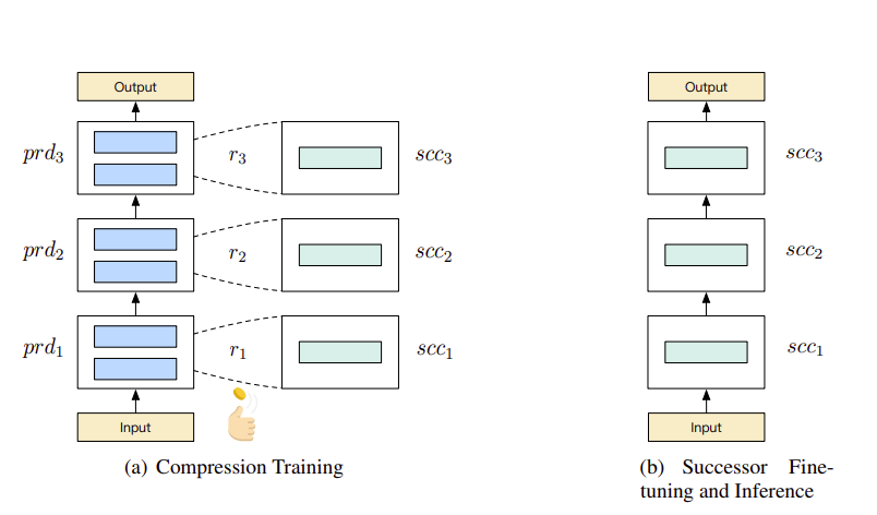 把训练分为两个过程,第一阶段使用模块替换(就是把原来的模型中的一些模块按照某些规则替换成更细更小的子层)。论文中把原始模型称为P_model,压缩后的模型称之为S_model,该训练阶段中考虑了P_model和S_model,它们都参与了训练;第二阶段单独S_model的微调阶段,就是为了让所有的S_model的模块参数训练任务中去。