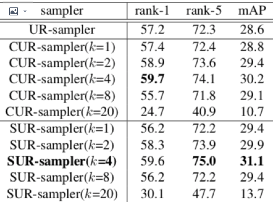 batch取为40,所以k=1,意味着一个minibatch只有一个人的40张照片,当k=20,一个人只有两张;但是k=1时,由于一个人的图片数可能少于40,所以一个minibatch是很可能出现两个人的图片;综合来看,单个人图片越少越难训练,因为k-20结果是最差的,而且差距很大。