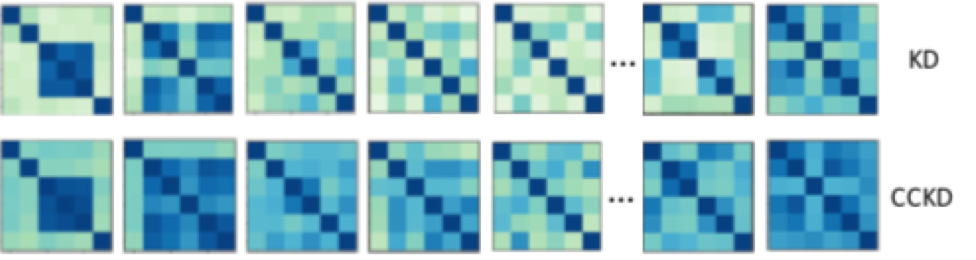 2),目标损失:所以文章最终的CCDK目标损失为,第一项为真实标签的交叉熵损失,第二项为原始蒸馏法的kl散度损失,第三项为本文新的到的Lcc损失