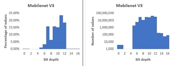 在这种情况下,下面的问题自然而然地出现了:编码神经网络权重和激活的最佳位深度是多少?有几个建议的数字格式可以减少位深度,包括Nvidia的TensorFloat,谷歌的8位非对称定点(Q8A)和bfloat16。但是,虽然这些格式是朝着正确方向迈出的一步,但不能说它们是最佳的:例如,大多数格式都为要表示的每个值存储一个指数,当多个值在同一区间时,这些指数可能是多余的。更重要的是,他们没有考虑神经网络的不同部分通常有不同的位深度要求这一事实。有些图层可以用较低的位深度编码,而其他图层(如输入和输出层)需要更高的位深度。MobileNet v3就是一个例子,它可以从 32 位浮点转换为大多数在 5-12 位区间内的位深度(见图 1)。