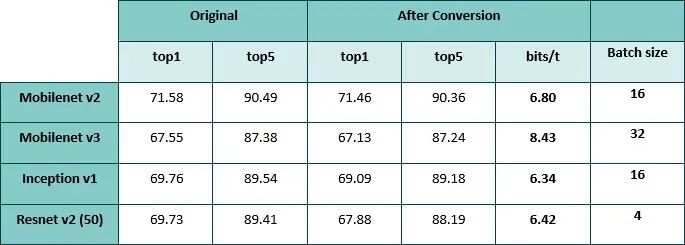 压缩分类网络的精确度。图 1 中的 Mobilenet v3 直方图是不同(较短)训练的结果,与此表中的网络相比,压缩程度较低。