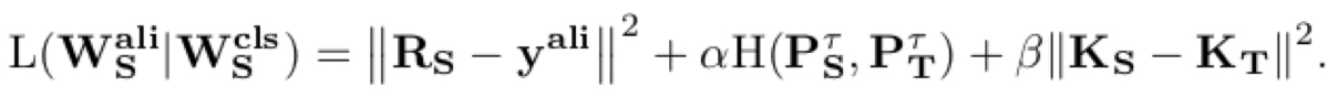 人脸对齐主要是对每张人脸图像定位出5个关键点的位置,所以通常人脸对齐是回归任务,因此,训练神经网络使用下面的欧式距离损失函数,Rt是教师网络的回归预测层,Pt是目标预测的soft概率,另外一个Kt可以是回归预测层的前一个隐层