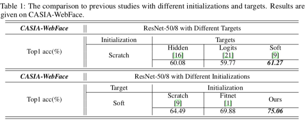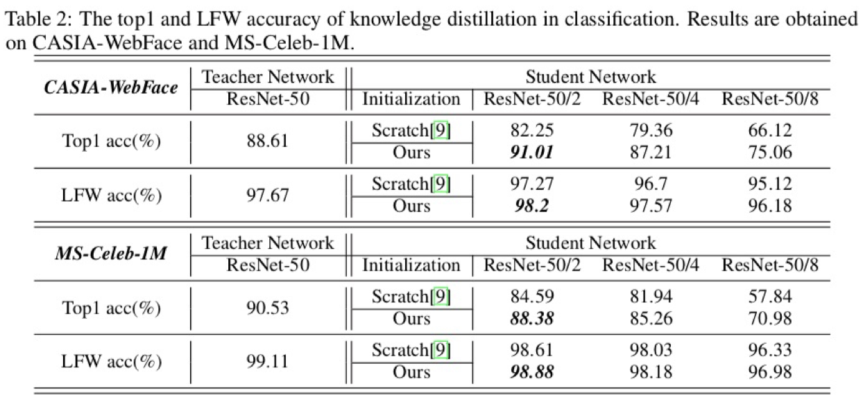 对于少量标签的训练集CASIA-WebFace,学生网络可能超越教师网络,比如学生网络98.2,教师网络97.67%对于MS-Celeb-1M,学生网络无法超越教师网络,没有任何学生网络超越教师网络99.11%