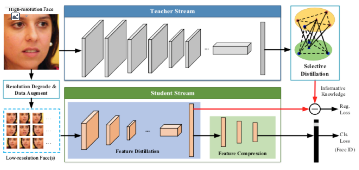所以蒸馏法中学生网络主要做这几件事:1)通过对有代表性的人脸和教师网络回归来训练学生网络;2)从低分辨率的人脸中挖掘未知的人脸线索,所以学生网络的训练使用如下的目标损失: