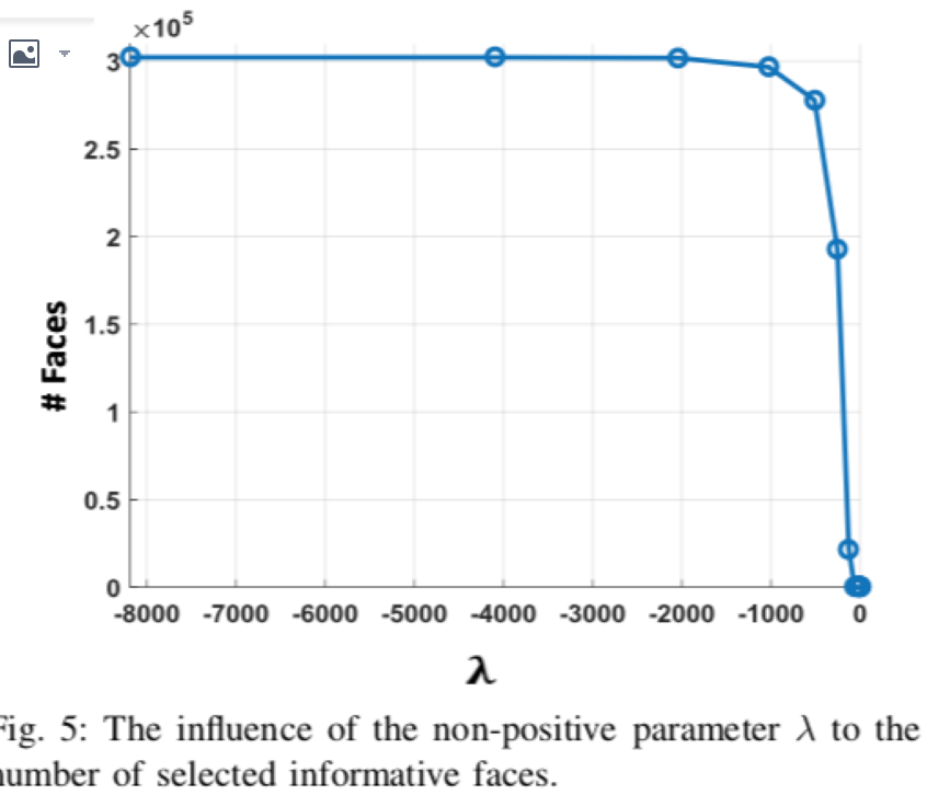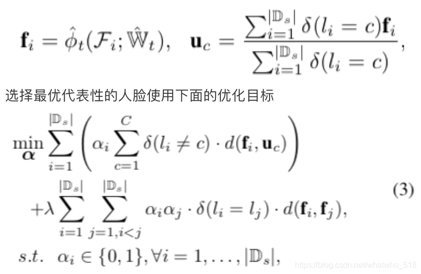 上面公式中的a为长度为所有人脸数的向量,值为1代表该人脸特征为代表性的,其他为0;d(fi,uc)代表当前人脸特征和别的人脸中心cos距离,所以公式前半部分表示选择最具有代表性的人脸和其他类的人脸距离很小, 后半部分的权重参数是个负数,所以第二项代表同一类的两个人脸向量d(fi,fj)要越大越好;综上上面公式说明最具有代表性的人脸选择准则:和别的人脸中心距离近,并且和自己同类的人脸距离远。
