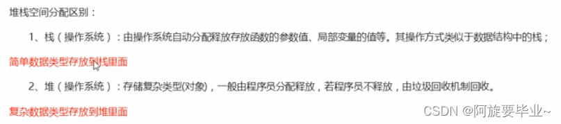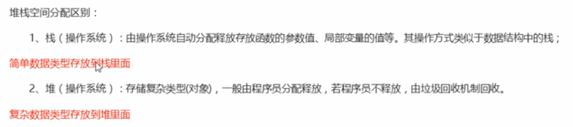 (2)复杂数据类型 。首先在栈中开辟空间,栈中存放的是16进制的地址,指向堆。复杂数据最终是存放在堆中的。
