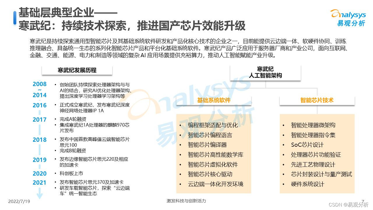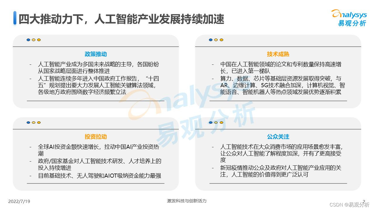 易观分析:2022年7月易观分析发布《中国人工智能产业生态图谱2022》。在政策和技术的推动下,人工智能向高速发展蓄力,多个应用领域商业化进程积极推进,各类科技企业在前沿技术加持下进场占位,赛道战况激烈。预计2022年人工智能技术的市场规模将达到2348亿元,增速将达到48%。