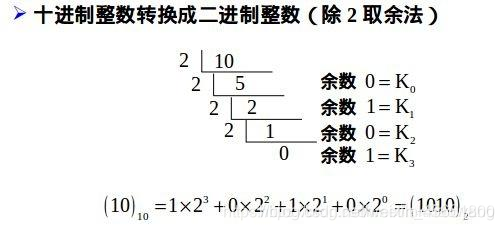 十进制数到二进制数的转换可以采用“除2取余,逆排序”法,具体转换过程是,用2去除一个十进制数,得到商和余数,然后再用2去除商,又会得到商和余数,循环往复直至商为0为止。转换过程如下图所示。