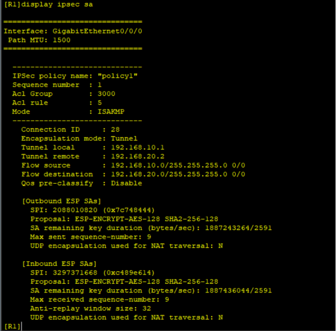 [R1-ipsec-proposal-tranl] esp encryption-algorithm aes-128 #配置esp封装验证算法。