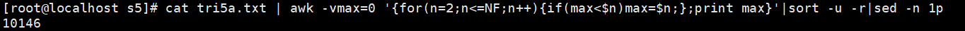 cat tri5a.txt | awk -vmax=0 '{for(n=2;n<=NF;n++){if(max<$n)max=$n;};print max}'|sort -u -r|sed -n 1p