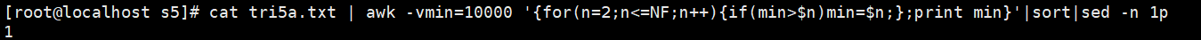 cat tri5a.txt | awk -vmin=10000 '{for(n=2;n<=NF;n++){if(min>$n)min=$n;};print min}'|sort|sed -n 1p![]()