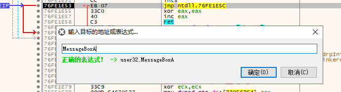 此外软件断点同样可以使用bp/bpx等命令下断,或通过bc来取消断点,当读者需要在特定函数上下断点时,可通过Ctrl+G调出地址跳转表达窗口,并输入如MessageBoxA等函数,跳转后手动下断点。