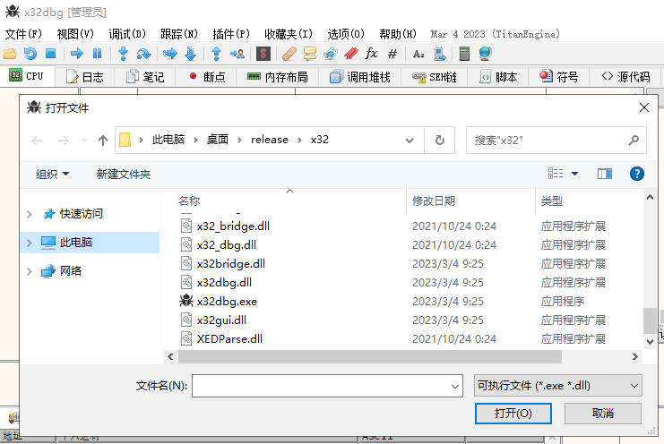 当用户需要打开调试程序时,可以通过菜单"文件"->"打开"(或者按下快捷键F3),会弹出如下图所示的打开文件对话框,默认对话框会停留在x64dbg软件的根目录,此时通过选择所需调试的进程即可打开调试;