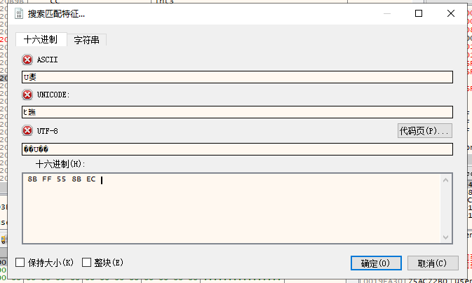 打开二进制搜索框,输入8B FF 55 8B EC即可用于检索上方的指令片段,也算是一种折中的方法;