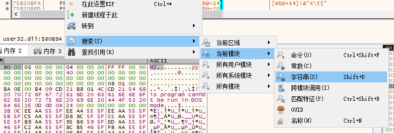 同时x64dbg还支持搜索字符串,通过右键菜单即可调出搜索框,并实现特殊字符串的检索;