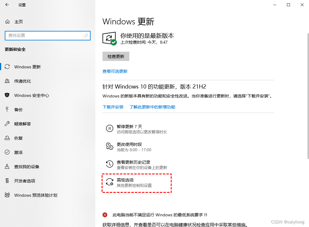 2.然后在Windows更新处,单出“高级选项”。
