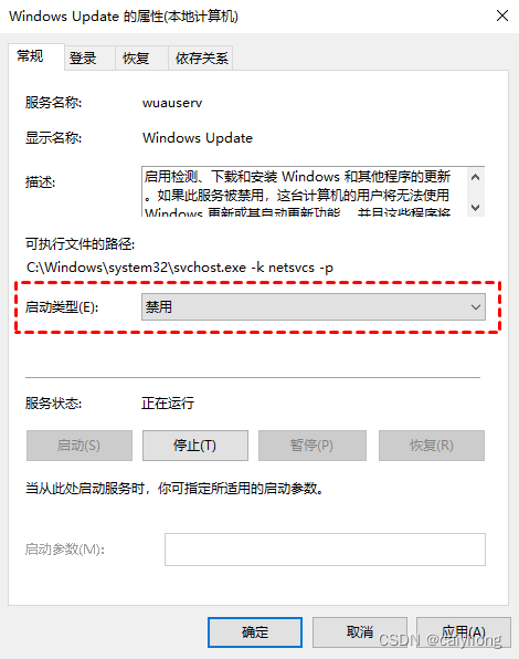 3. 在弹出的"Windows Update属性"对话框中,将“启动类型”设置为“禁用”