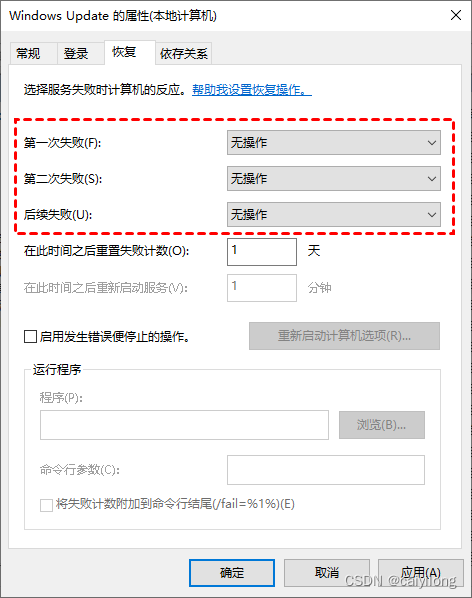 4. 然后再单击“ 恢复 ” ,将图中框选部分都设置为“ 无操作 ” , 再单击 “ 应用 ” 和“ 确定 ”。