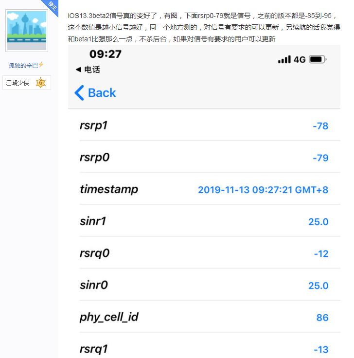 这位网友说道:“iOS13.3beta2信号真的变好了,有图,下面rsrp0-79就是信号,之前的版本都是-85到-95,这个数值是越小信号越好,同一个地方测的,对信号有要求的可以更新,另续航的话我觉得和beta1比强那么一点,不杀后台,如果对信号有要求的用户可以更新。”本次更新并不杀后台了看来这个杀后台问题已经得到了解决。