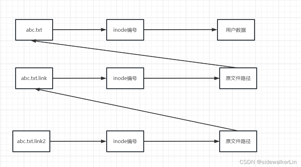 如上图所示,我建立了2个软连接,当我查看或修改abc.txt.link2的内容时,会先根据自己的文件名找到文件的inode编号,进而找到文件块中保存的原文件abc.txt.link的地址。而abc.txt.link会重复上面的操作,通过原文件abc.txt的路径,找到abc.txt,查看或修改它。