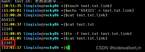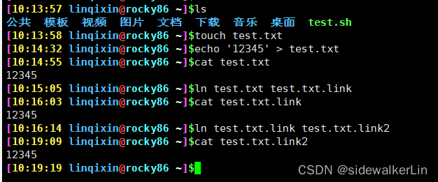 touch test.txt #在当前目录下创建test.txt文件echo '123456' > test.txt #将字符写入到test.txt文件中cat test.txt #查看test.txt的内容ln test.txt test.txt.link #对test.txt新建一个硬连接test.txt.linkcat test.txt.link #查看test.txt.link的内容ln test.txt.link test.txt.link2 #对test.txt.link新建一个硬连接test.txt.link2cat test.txt.link2 #查看test.txt.link2的内容