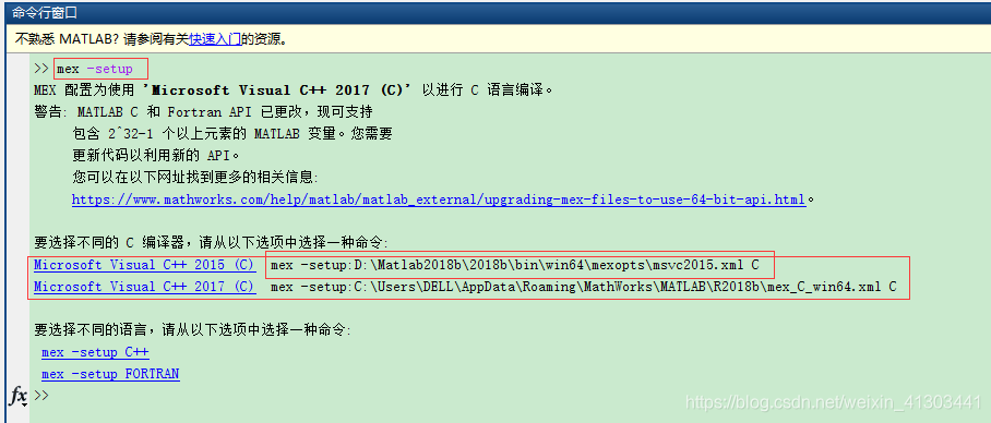 在MATLAB命令行中输入mex -setup, 出现如下提示: