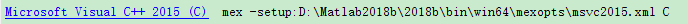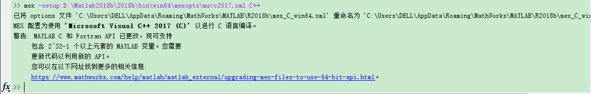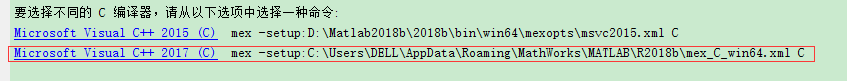 所以在命令行输入mex -setup:D:\Matlab2018b\2018b\bin\win64\mexopts\msvc2017.xml C++此条命令是复制了VS2015的路径,然后将2015改为2017,C改为C++,出现如下提示