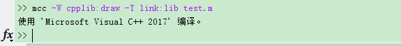 然后再输入mcc -W cpplib:draw -T link:lib test.m,其中draw是编译后生成的相关文件名,test.m是自己写的MATLAB程序的文件名,函数名仍为test,输入后,稍等数十秒