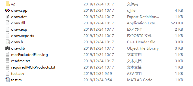 然后将MATLAB程序编译后的如下四个文件添加到MFC工程目录下,其中draw.ctf在V2目录下