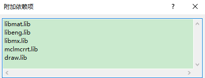 打开“项目-》xxx属性-》链接器-》输入”添加libmat.lib libeng.lib libmx.lib mclmcrrt.lib draw.lib