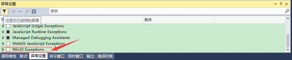 最后编译运行此工程后,在VS界面右下角取消Win32 Exception的勾选