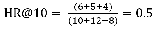 在此我引用其他前辈文章(文末给出引用)的一个例子:三个用户在测试集中的商品个数分别是10,12,8,模型得到的top-10推荐列表中,分别有6个,5个,4个在测试集中,那么此时HR的值是: