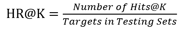 其中,分母是所有的测试集中target items的总和,分子表示每个用户top-K列表中命中测试集合的item个数的总和。