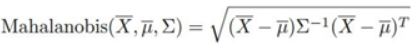 - 马氏距离:计算样本X与中心点 μ 的距离,也可做异常分值,计算方式: