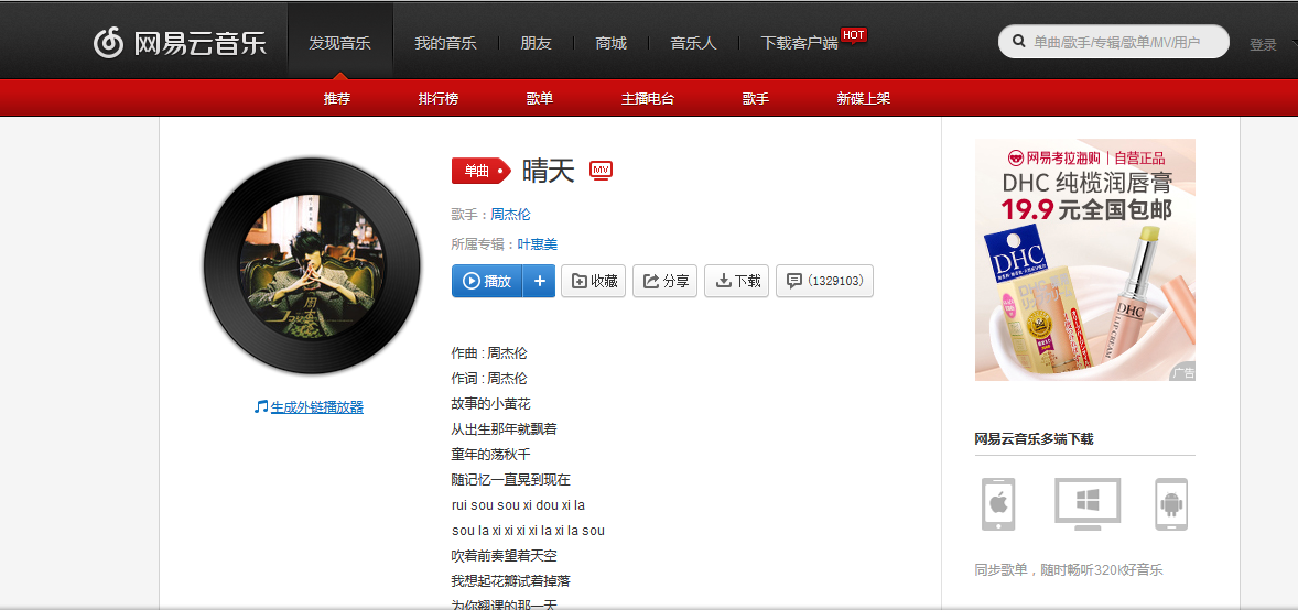 首先打开网易云音乐的网页版,随便选择一首歌曲打开它的网页,这里我以周杰伦的《晴天》为例。如下图1