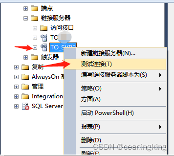 5. 点击【确定】保存( 如果设置有误,则有提示 )。右击已新建的链接服务器。选择【测试连接】,则有相关提示.